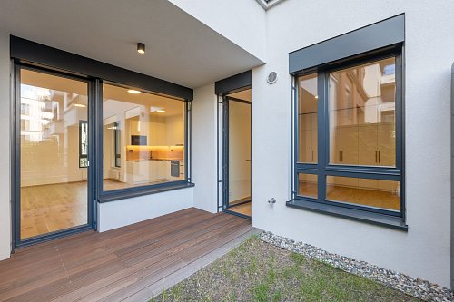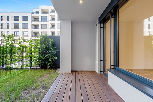 Přízemní byt s vanou, komorou ve které je příprava na pračku, terasou a menší zahrádkou, byt je vybavený zabezpečovacím systémem a předokenními žaluziemi.
