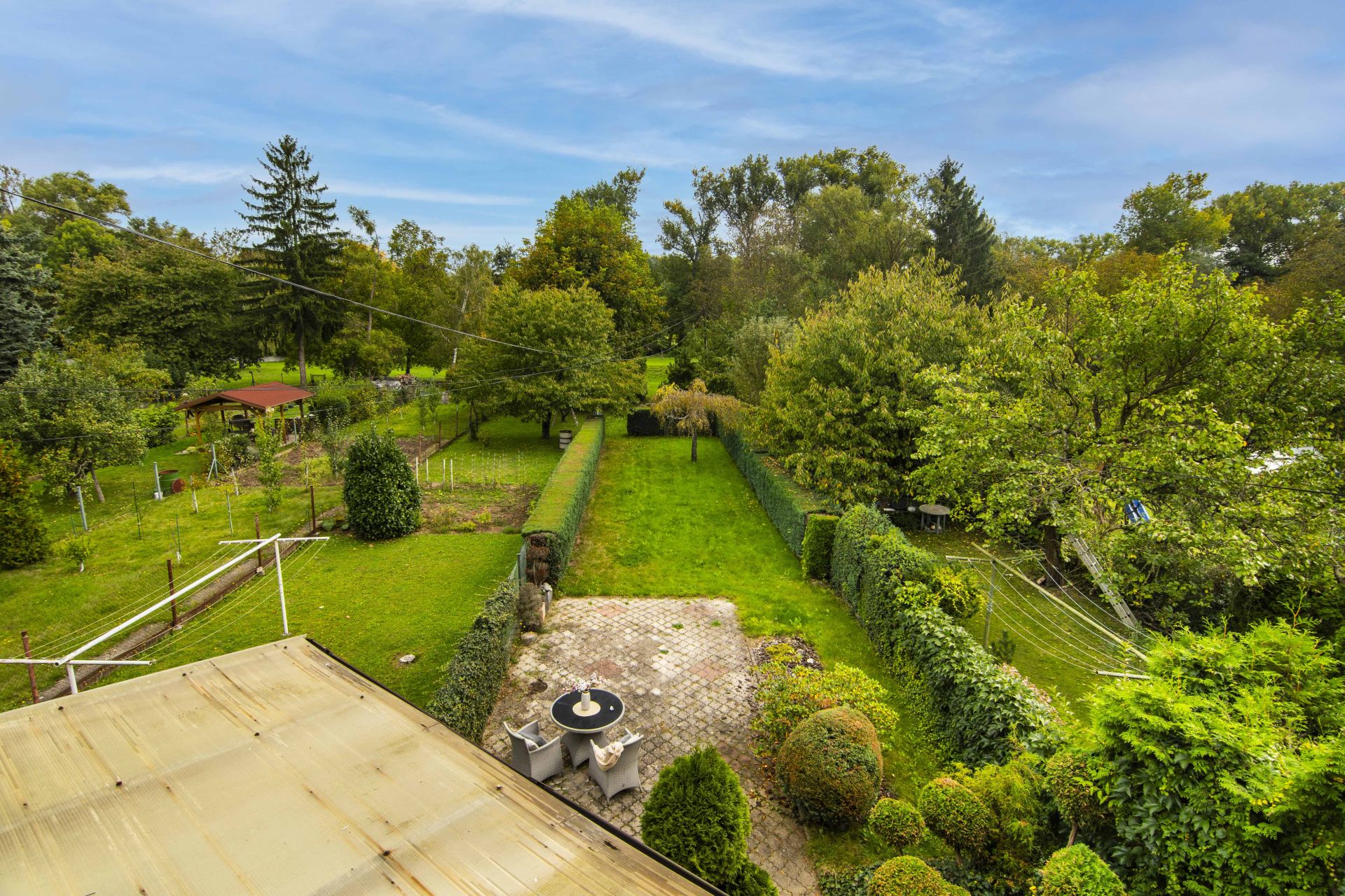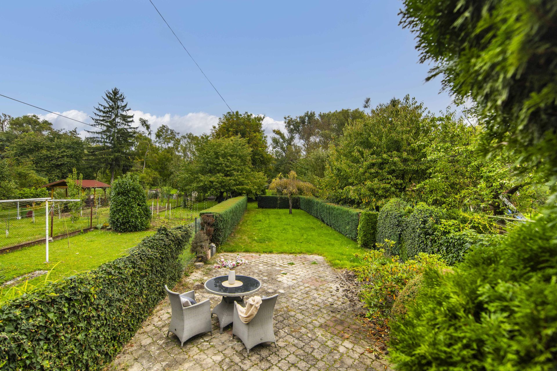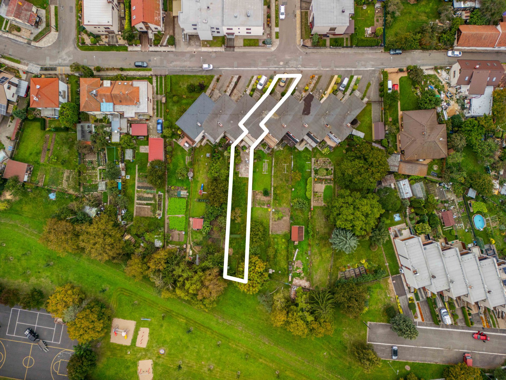 Je tu i místo pro vlastní pěstování a branka, která vede přímo na dětské a sportovní hřiště.