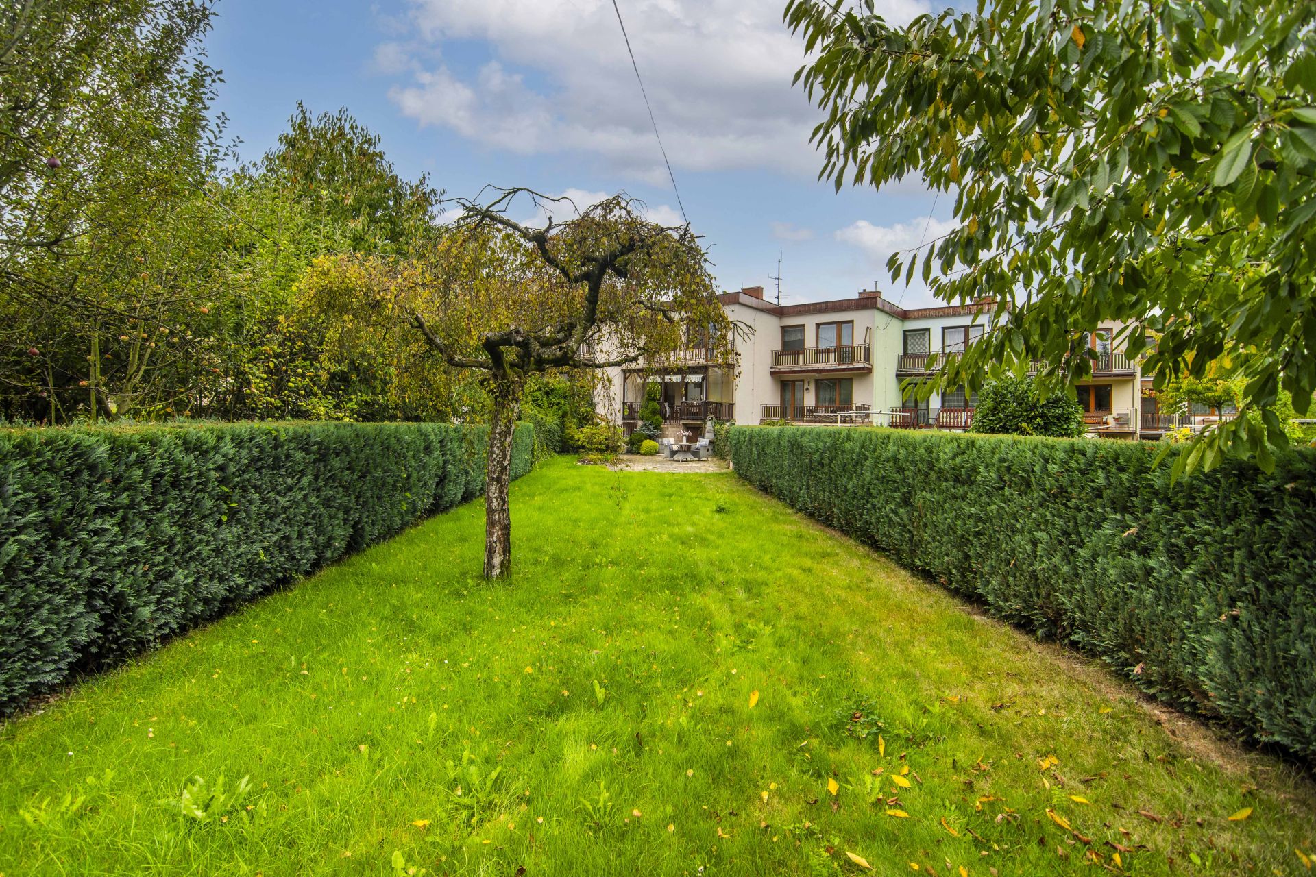 Zahrada je zatravněná a o její svěží vzhled se stará automatický zavlažovací systém Hunter.