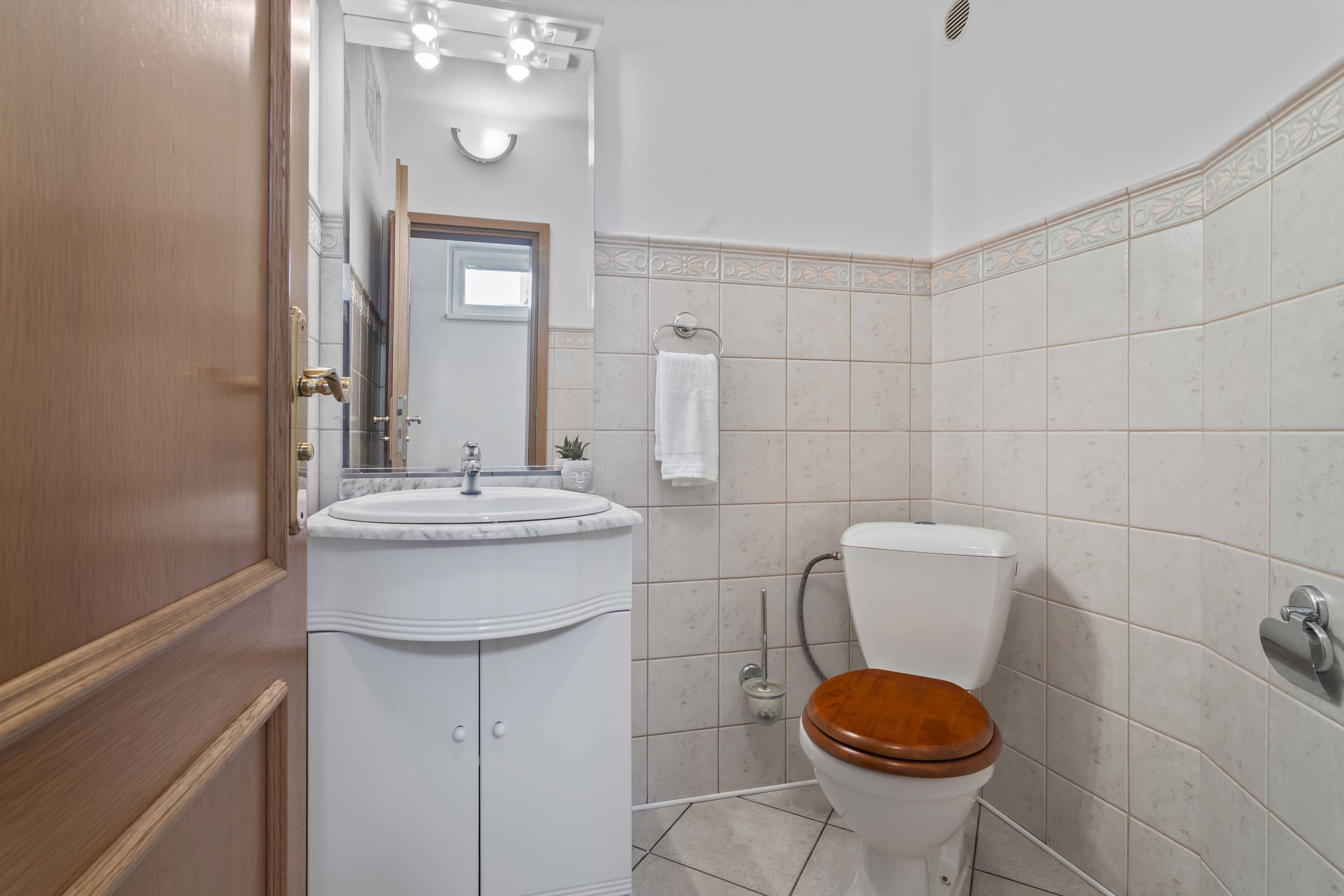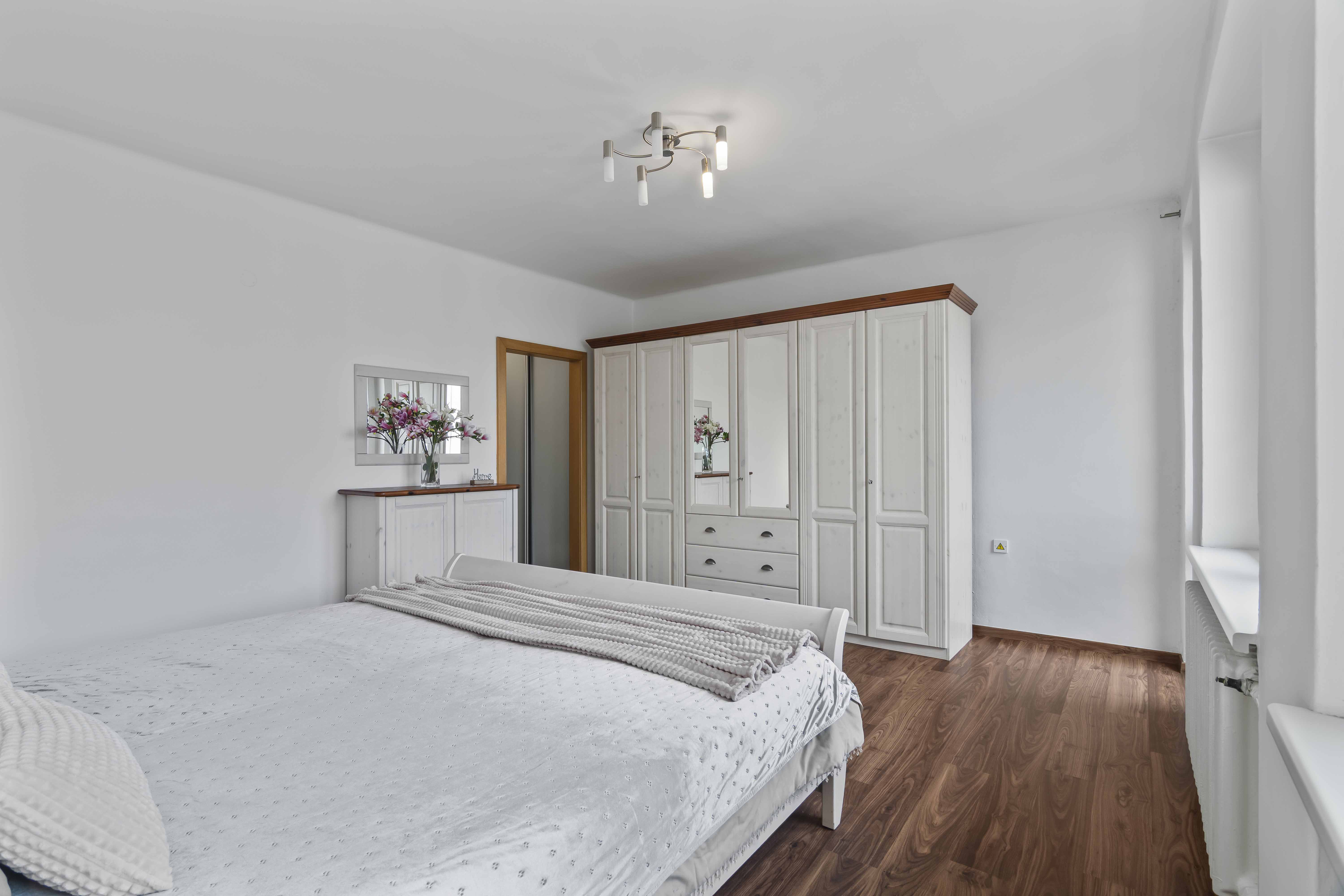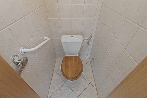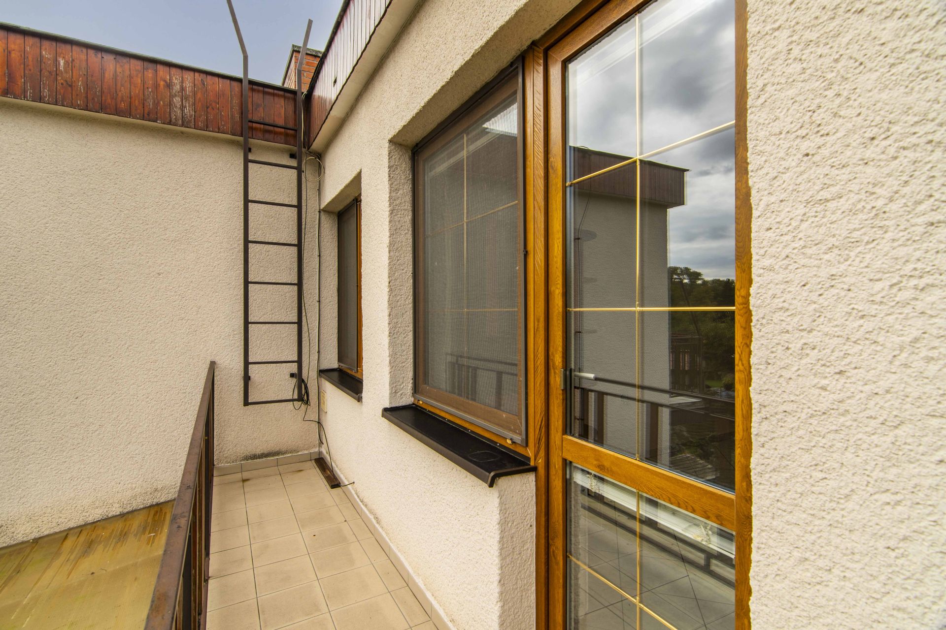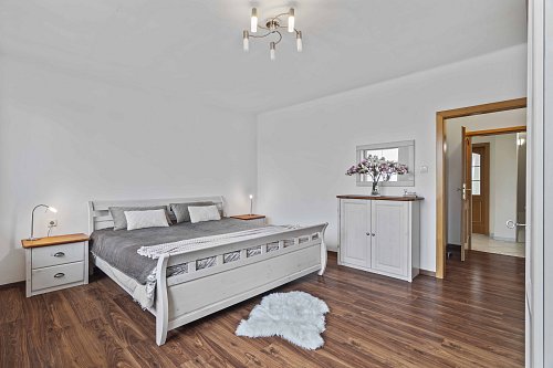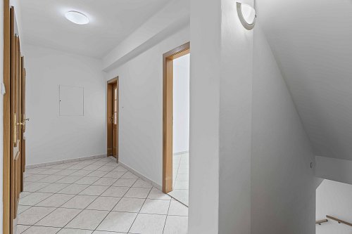 V patře najdete ložnici se šatnou a lodžií, dva další pokoje, koupelnu s vanou a toalety v obou podlažích.