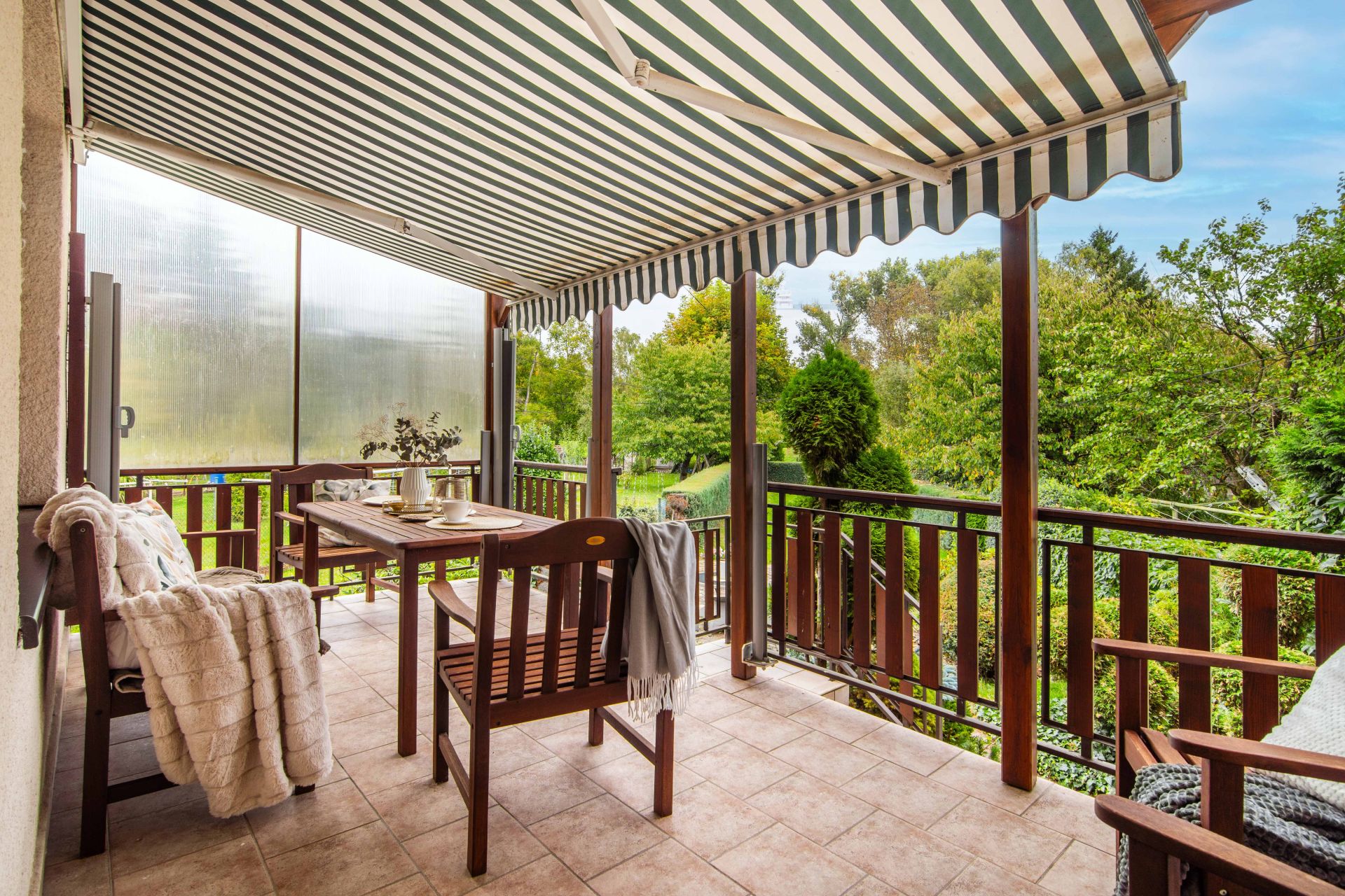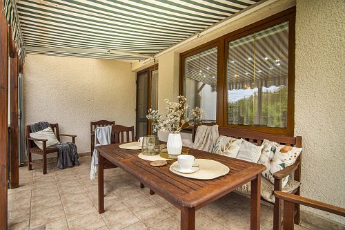 Dominantou je vyvýšená zastřešená terasa (12 m²) s mobilním zavětrováním, takže si ji užijete po celý rok – ať svítí slunce, prší nebo fouká vítr.
