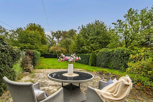 Nechybí zahradní krb, posezení, okrasné dřeviny a živé ploty, které zajišťují příjemné soukromí.