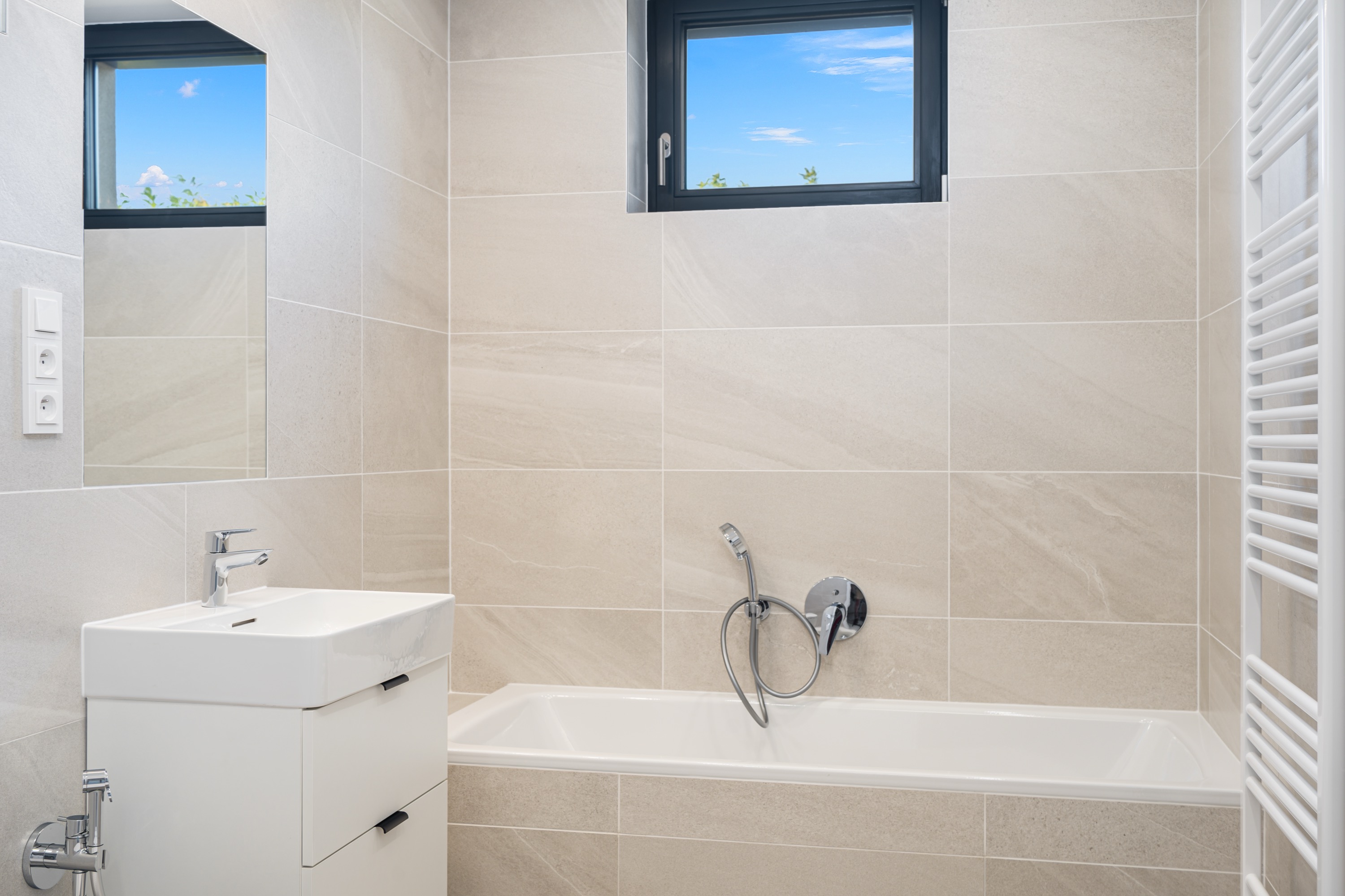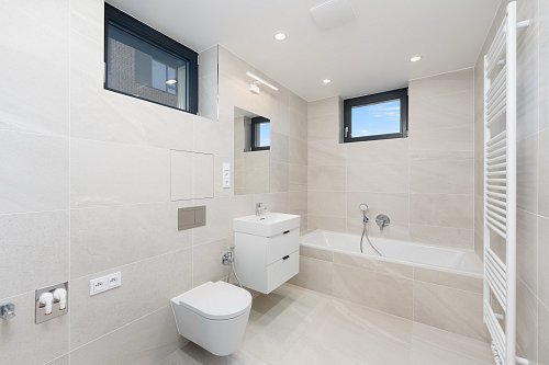 V předsíni a v ložnici je k dispozici velká vestavěná skříň a k uložení věcí je zde i praktická komora 3,5 m². Koupelna s vanou je společná s toaletou a nechybí zde ani příprava pro umístění pračky a otopný žebřík.